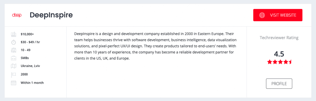 Techreviewer is a service that selects the best companies from all over the world working in different tech niches. They regularly review and choose the most popular companies presented in their database and range them according to clients’ reviews, level of expertise, and other criteria. This time, we’ve been ranked among top software development companies.