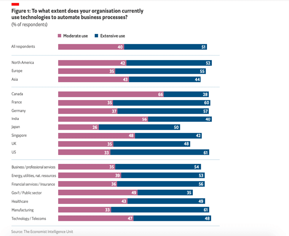 According to The advance of automation report by Economist, automation is coming to be seen as a technology initiative of strategic importance to the organization. Of the 502 participants from Canada, France, Germany, India, Japan, Singapore, the UK and the US in the survey, more than nine in ten say their organization uses technology to automate business processes: 51% confirm extensive use and 40% moderate use.