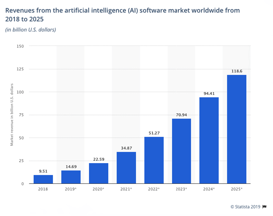 According to the market research firm Tractica, the global artificial intelligence software market is expected to experience massive growth in the coming years, with revenues increasing from around 9.5 billion U.S. dollars in 2018 to an expected 118.6 billion by 2025. The overall AI market includes a wide array of applications such as natural language processing, robotic process automation, and machine learning.